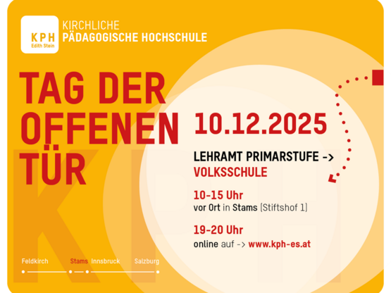 Die KPH Edith Stein bildet Lehrer:innen und Pädagog:innen aus, die junge Menschen auf ihrem Bildungsweg kompetent und engagiert begleiten. An vier Standorten im Westen Österreichs eröffnet sie vielfältige Wege ins Bildungswesen – vom Bachelor- und Masterstudium in Lehramt Primarstufe und Sekundarstufe über Studiengänge in Religionspädagogik, Sozialpädagogik und Elementarpädagogik bis hin zu berufsbegleitenden Hochschullehrgängen und Fortbildungen für im Dienst stehende Pädagog:innen.