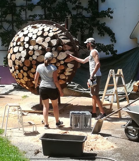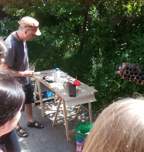 Heuer findet erstmals in Stams ein Bildhauersymposium statt und die Studierenden des LebensArt-Schwerpunktes nutzten diese Gelegenheit, um der Künstlerin und den Künstlern über die Schulter zu schauen. Der Organisator und selbst aktive Stamser Künstler Othmar Senn lud in sein Gartenatelier. Die Studierenden waren erstaunt und begeistert, welche Skulpturen dort über die Jahre entstanden sind - vom Innpferd (aus einem alten Boiler) bis hin zu großen Metallköpfen aber auch filigranen Metallapplikationen an der Hauswand. Der Künstler findet entweder Materialien, oder sie finden ihn. Weitere Künstler_Innen sind Sandra Brugger und Manfred Hellweger, die derzeit gemeinsam an einer großen Holz-Metall-Skulptur arbeiten. Auch das Gespräch mit ihnen war für die Studierenden des Schwerpunktes sehr beeindruckend. Als vierter Künstler zeigte uns Christian Ladner seine Werke. Für das Symposium arbeitet er an einer Fisch-Serie, die durchaus auch politische Brisanz aufweist und zum Nachdenken und Aufrütteln, aber auch zum genauen Hinschauen anregt.