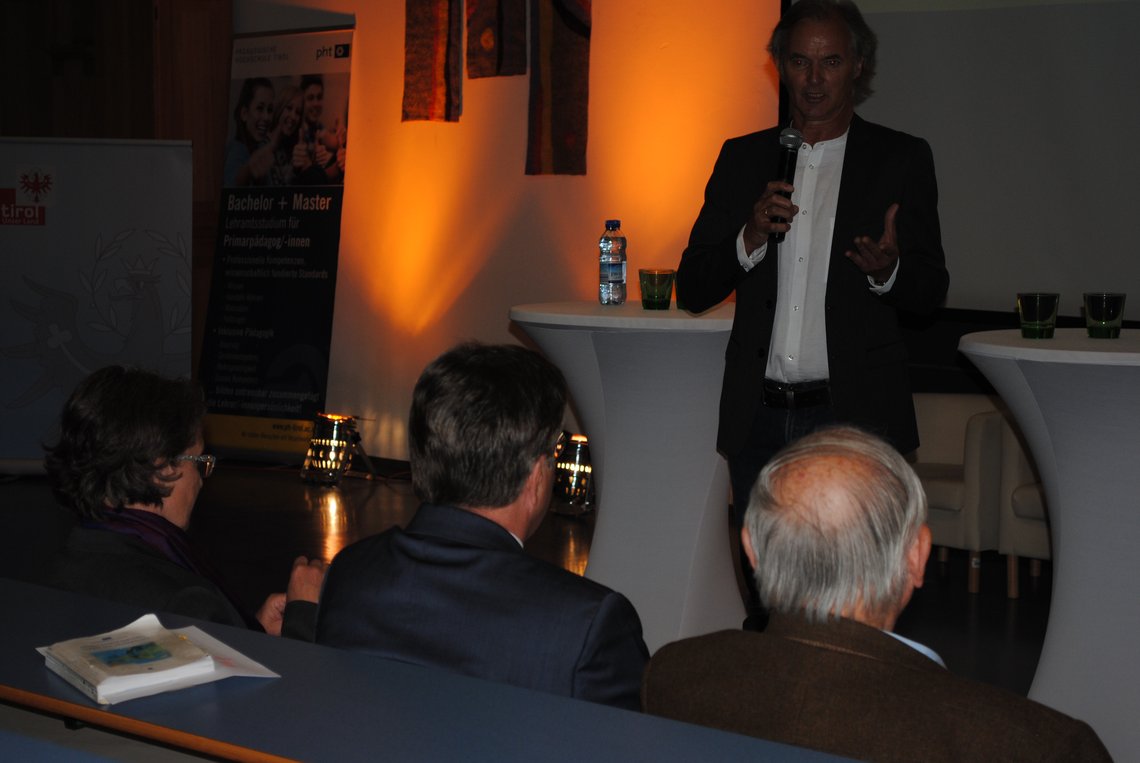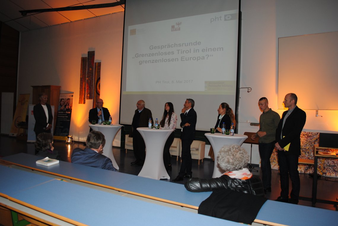 Anlässlich des Europatages am 09. Mai 2017 fand zum ersten Mal im Rahmen der bundesweiten Kampagne „Aktionstage Politische Bildung“ eine Gesprächsrunde an der Pädagogischen Hochschule Tirol statt. In Zusammenarbeit mit dem Land Tirol, der PHT und der Kirchlichen Pädagogischen Hochschule Edith Stein wurde das Thema „Grenzenloses Tirol in einem grenzenlosen Europa“ von verschiedenen Persönlichkeiten aus den Bereichen Bildung, Politik und Wissenschaft kritisch beleuchtet. In Zeiten der Unsicherheit, in denen der Ruf nach Abschottung immer lauter wird, scheinen Barrieren ein subjektives Sicherheitsgefühl zu vermitteln. Die Auseinandersetzung mit mentalen und nationalen Grenzen war Ausgangspunkt dieser Podiumsdiskussion.