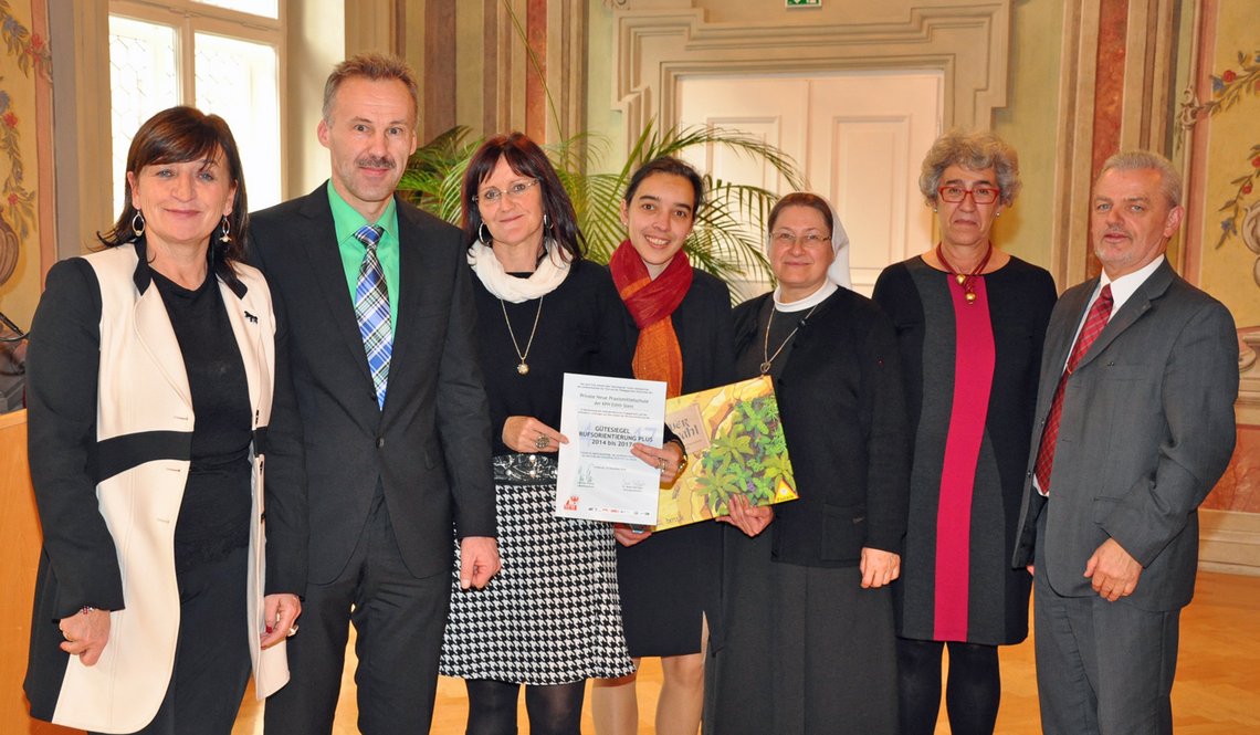 Welcher Beruf passt am besten zu mir? Welche Ausbildungsmöglichkeiten gibt es? Antworten auf diese und ähnliche Fragen bietet der Berufsorientierungsunterricht in der siebten und achten Schulstufe. Als eine von sieben Tiroler Schulen, die Jugendliche auf ihrem Weg ins Erwerbsleben mit besonders qualitätsvoller Beratung unterstützen, zeichnete Bildungslandesrätin Beate Palfrader am Mittwoch mit dem Gütesiegel „Berufsorientierung plus“ die Praxis NMS der Kirchlichen Pädagogischen Hochschule – Edith Stein aus. Die Auszeichnung „Berufsorientierung plus“ darf drei Jahre lang geführt werden und ist mit einem Preisgeld in Höhe von 5.000 Euro dotiert.