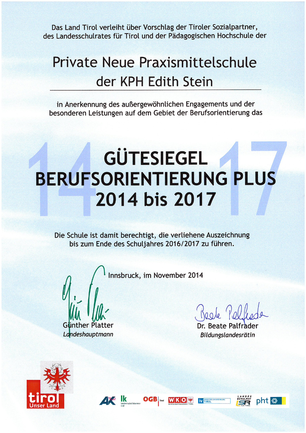 Das Gütesiegel „Berufsorientierung Plus“ ist ein Gemeinschaftsprojekt des Landes Tirol, der Tiroler Wirtschaftskammer, den Tiroler Sozialpartnern, dem Landesschulrat für Tirol und der Pädagogischen Hochschule Tirol.
