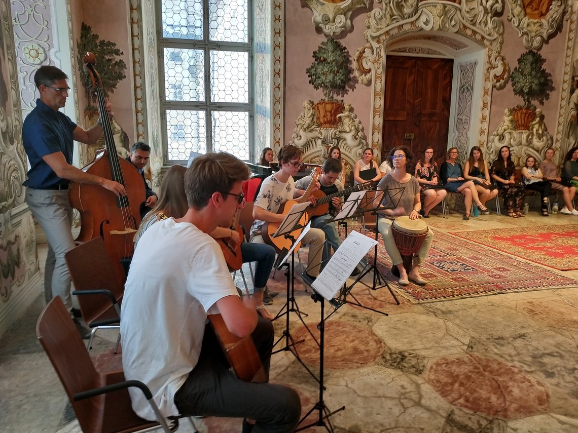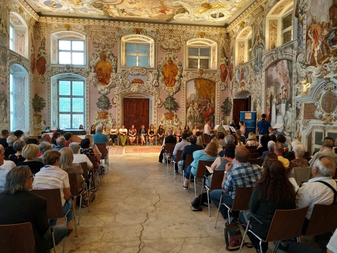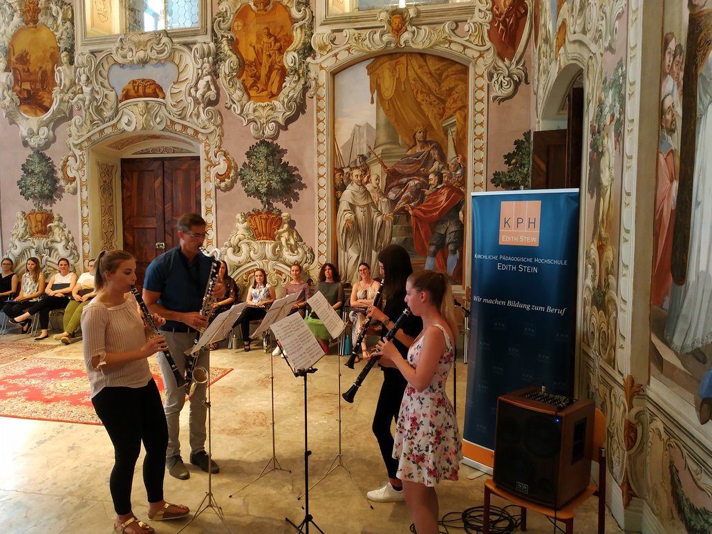 Studierende und Lehrende der Kirchlichen Pädagogischen Hochschule Edith Stein luden am 5. Juni zum jährlichen Chorkonzert am Standort Stams. „Höret die innere Stimme“ schrieb Bernhard von Clairvaux am Beginn des 12. Jahrhunderts. Was zahlreiche Gäste im Bernardisaal des Stiftes Stams zu hören bekamen waren viele kräftige, frohe und wohl klingende Stimmen und Instrumente aus dem Inneren unserer Hochschule. Studierende und Lehrende präsentierten ein breit gefächertes Programm, ua mit Gesangswerken von Werner Beidinger, Anton Diabelli und Erich Opitz. Zum Besten gegeben wurden aber auch Stücke für Gitarren, Klavier und Klarinetten, etwa von Paul Harvey oder Michael Langer. Bei herrlichem Wetter klang der Abend im Vorgarten der Basilika bei einer Agape aus.