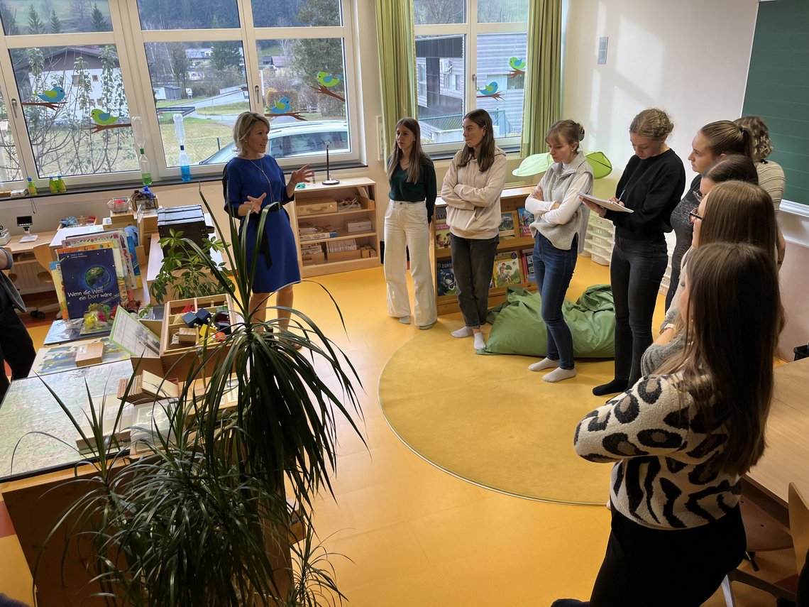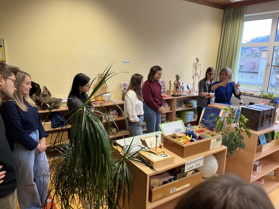 Für die zweite Hospitation machten sich die Studierenden auf in unser Nachbarbundesland Salzburg und besuchten die öffentliche VS Voglau in Abtenau. Hier wird handlungsorientiert mit Jahrgangsmischung unterrichtet. In den ersten zwei Unterrichtsstunden findet die von den Lehrer:innen intensiv betreute individuelle Lernzeit im Sprach-, Mathematik- und Forscherraum statt. Nach der Lernzeit treffen sich die Kinder, um ihre Arbeiten vorzustellen. Im darauffolgenden geschlossenen Unterricht werden Mathekonferenzen abgehalten, Lernwörter eingeführt, der Buchstabe der Woche besprochen, der Klassenrat und das tägliche Lesetraining durchgeführt. Das Voglauer Schulkonzept „Handlungsorientierter Unterricht mit Jahrgangsmischung“ setzt sich u.a. aus unterschiedlichen Elementen zusammen: Silbenanalytische Methode nach Röber, Systematisches Lesekompetenztraining, Freinet Pädagogik und besonders im mathematischen und kosmischen Bereich mit der Montessori Pädagogik.
