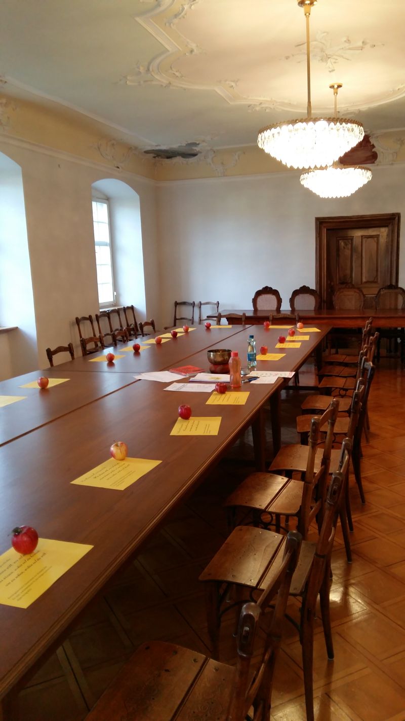 Nach einem vorzüglichen Mittagessen im Klosterkeller verschafften sich die Teilnehmerinnen und Teilnehmer in Teamarbeit bei Sonnenschein im Innenhof des Klosters einen Überblick zu einem bestimmten Thema (Kaiser Konstantin, Reformation, II. Vatikanisches Konzil …).