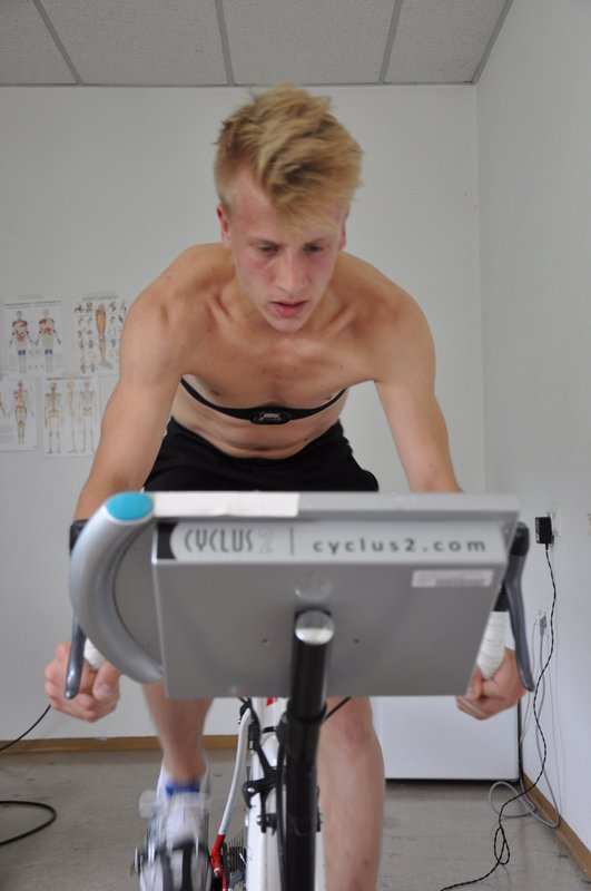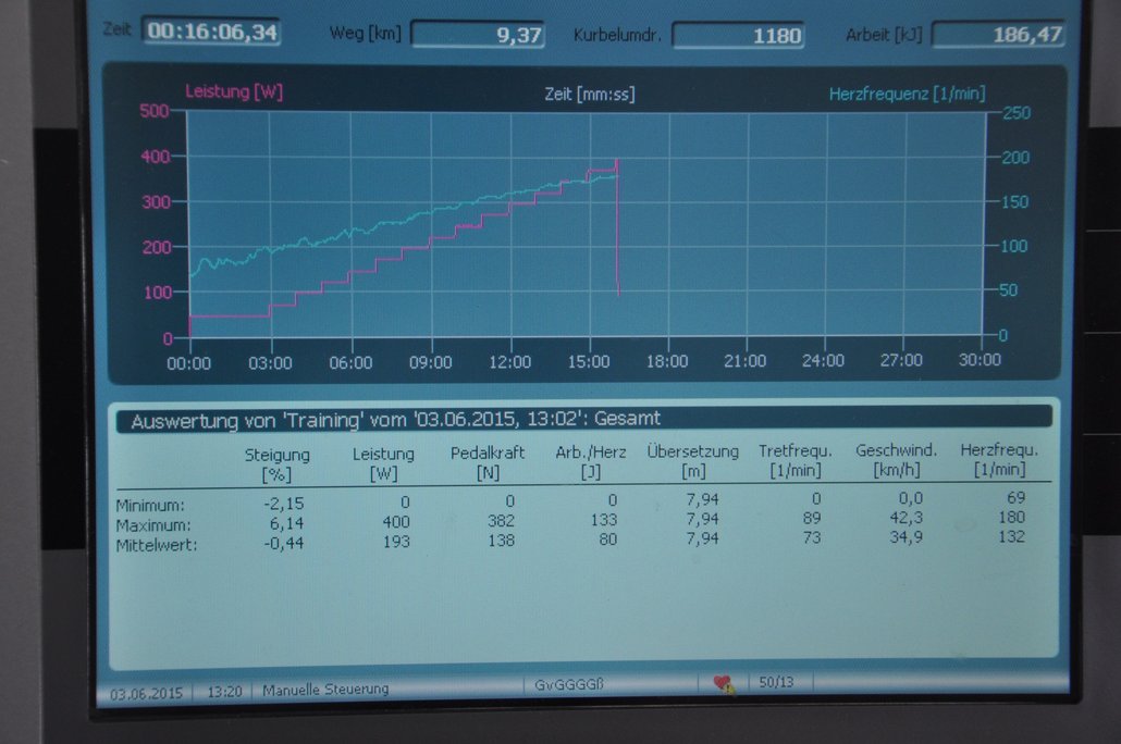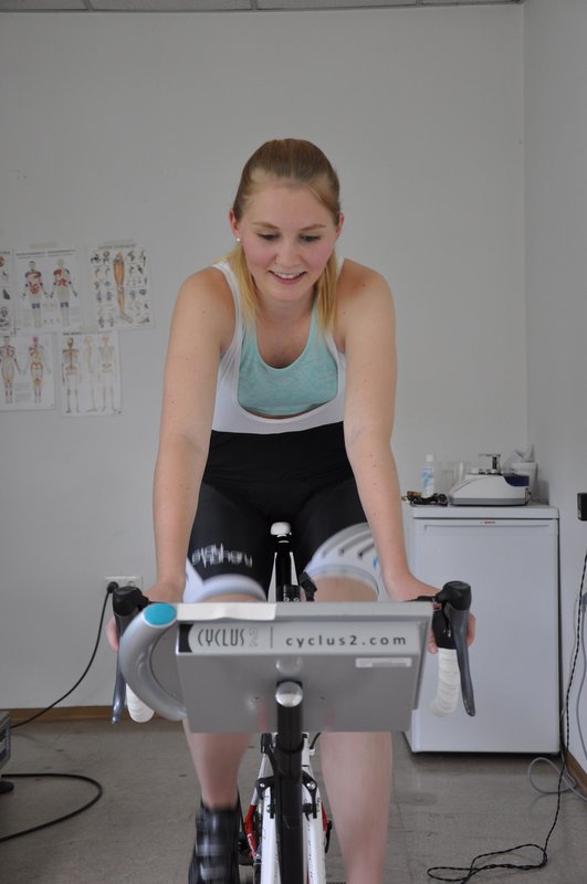 Im Rahmen der Lehrveranstaltung „Gesundheit und Fitness“ führten Studierende des Studiengangs „Bewegungs- und Sporterziehung“ Anfang Juni am Institut für Sportwissenschaft der Universität Innsbruck eine Fahrradergometrie durch. Es handelt sich dabei um eine Belastungsform unter standardisierten Laborbedingungen. Die Studierenden absolvierten ein so genanntes Stufenprotokoll. Dieses Belastungsprotokoll wird durch die Festlegung von Eingangsstufe, Stufendauer und -höhe definiert. Nach einer 3-minütigen Aufwärmphase mit 50 Watt (Tretwiderstand) kam es zu einer kontinuierlichen Steigerung der Wattzahl (25 Watt/Minute). Die Ergometrie wurde bis zum Abbruch aufgrund physischer Erschöpfung durchgeführt. Zudem wurde aus dem Kapillarblut (Ohrläppchen) die Blutlaktatkonzentration bestimmt (Ruhewert und nach Ausbelastung). Die maximal erreichte Blutlaktatkonzentration (Lamax) gilt neben der maximalen Herzfrequenz als wichtiges Ausbelastungskriterium. Die Ergometrietestung sollte den Studierenden neben einer präzisen Erfassung der aktuellen körperlichen Leistungsfähigkeit auch einen Einblick in die sportmedizinische Leistungsdiagnostik ermöglichen Als angehende Sportlehrkräfte konnten sie somit hautnah und intensiv wichtige Bereiche der Sportphysiologie im worteigenen Sinn „erleben“.