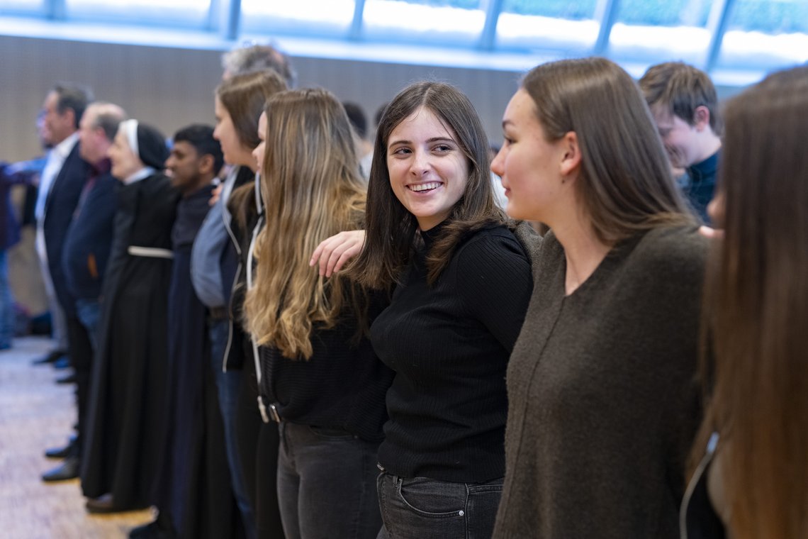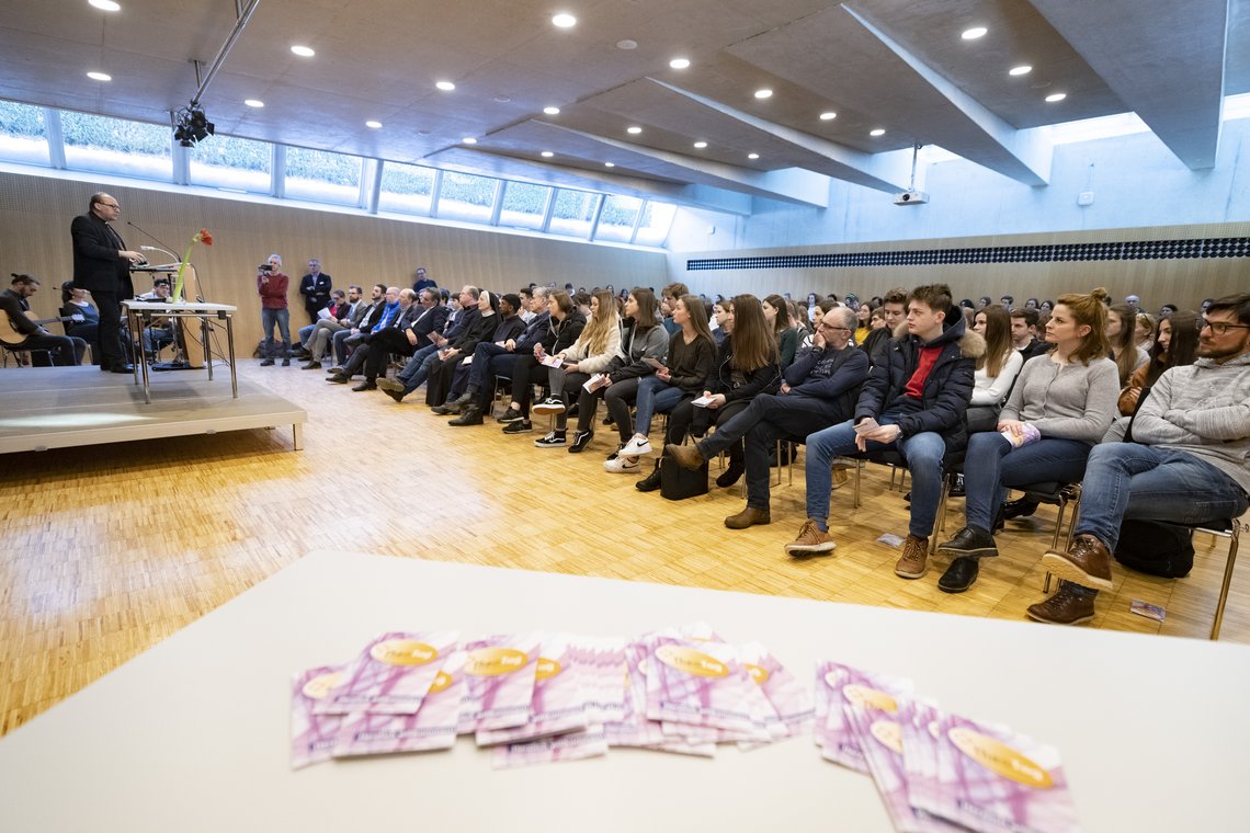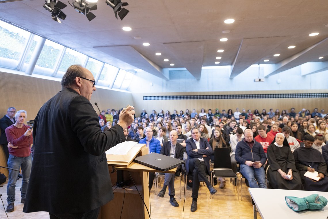 Mit vier Symbolen begrüßte Bischof Hermann Glettler die Schülerinnen und Schüler, die zum TheoTag gekommen waren: Eine Amaryllis-Blume präsentierte er als Zeichen dafür, „was in uns aufblühen möchte“, als Symbol für „Freundschaft, Beziehung und alles, was unser Leben wertvoll macht.“ Als zweites Symbol hielt Glettler einen Boxhandschuh in die Höhe: „Welche Vision von Leben haben wir vor uns“, fragte der Bischof. „Dass der Stärkere siegt oder dass wir auch einen Platz für Menschen öffnen, die sich schwer tun und deren Leben beeinträchtigt ist“. Mit einem steinernen Herz mahnte der Bischof vor innerer Gleichgültigkeit und einem verhärteten Herzen. „Höre auf dein Herz, wahrscheinlich findest du darin eine Spur für deinen künftigen Beruf“, so der Bischof. Zuletzt zeigte Glettler auf sein Mikrophon: „Das Mikrophon ist offen. Sag, was dich bewegt und was du aus deinem Leben machen möchtest.“