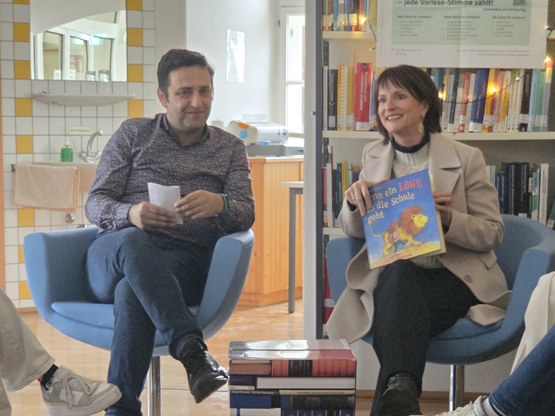 Ein besonderes Highlight setzte Bibliothekar Farid Zino, der das Bilderbuch „Wenn ein Löwe in die Schule geht“ von Friedl Hofbauer eigens ins Arabische übersetzte und gemeinsam mit Sonja Waldner präsentierte.