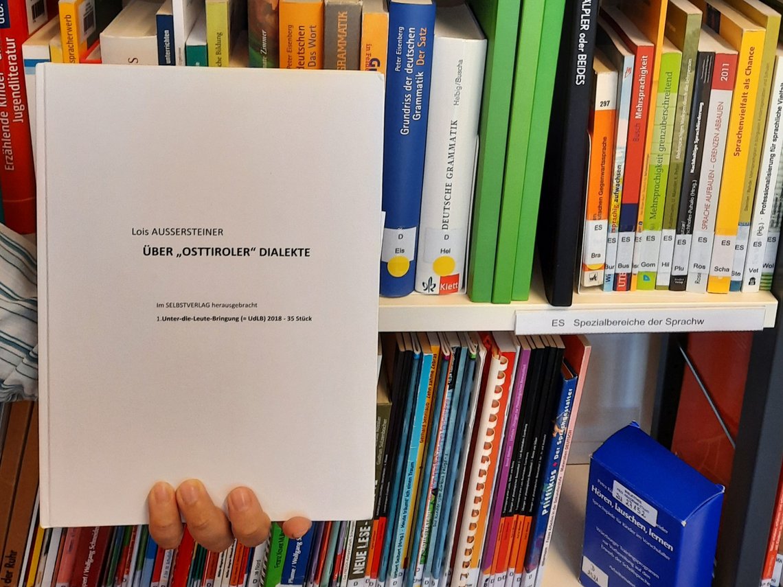 Farid Zino durfte fünf neue Bände über „Osttiroler Dialekte“ entgegennehmen und an passender Stelle inventarisieren. Die darin enthaltenen Ausführungen sind grundlegend und für mögliche weiterführende Arbeiten zum Thema äußerst wertvoll. Ein herzlicher Dank ergeht an den Verfasser Mag. Lois Außersteiner sowie an HR Prof. i. R. Dr. Hubert Brenn als Vermittler.