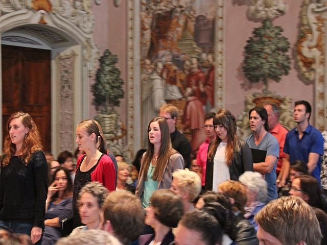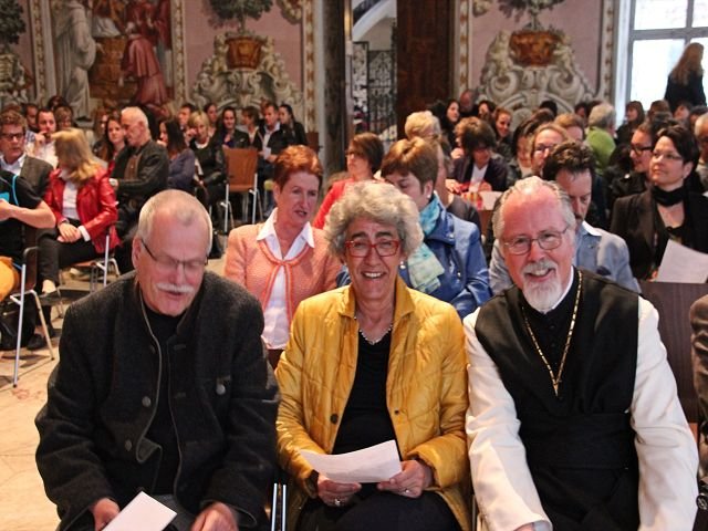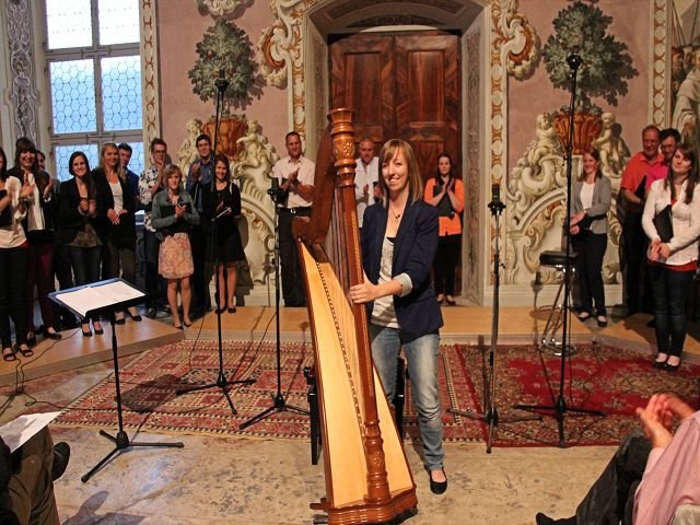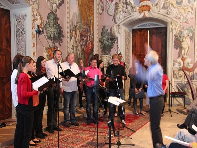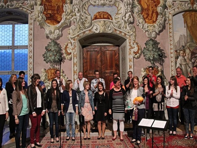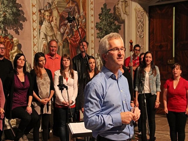 In einem dramaturgisch gekonnt angelegten Reigen ebenso ansprechender wie anspruchsvoller musikalischer Leckerbissen präsentierten sich der Chor der KPH-Edith Stein – im letzten Lied unterstützt von Kontrabass und Percussion, das Vokalensemble und Instrumentalsolistinnen mit Violinen, Harfe und Ziehharmonika in heiterer Musizierlaune. Souverän führte Chorleiter Mag. Thomas Kranebitter die bestens vorbereiteten Sängerinnen und Sänger, die auch zahlreiche solistische Aufgaben bravourös meisterten, durch die Lieder unterschiedlichster sprachlicher und stilistischer Provenienz. Stürmischer, mit einer Zugabe bedankter Applaus und die Einladung zum gemütlichen Beisammensein in der Speckbachervilla rundeten dieses Fest für Ohren und Augen im historischen Ambiente des Bernardisaals ab.