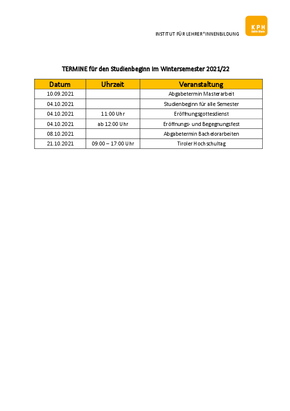 TERMINE für den Studienbeginn im Wintersemester 2021/22