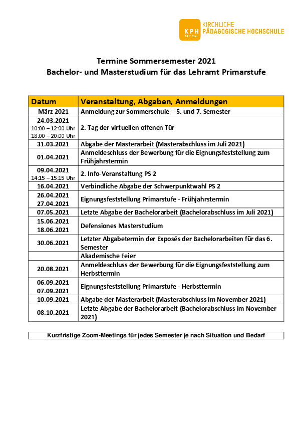 Termine Sommersemester 2021 Bachelor- und Masterstudium für das Lehramt Primarstufe