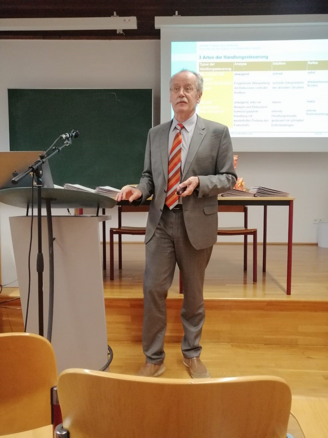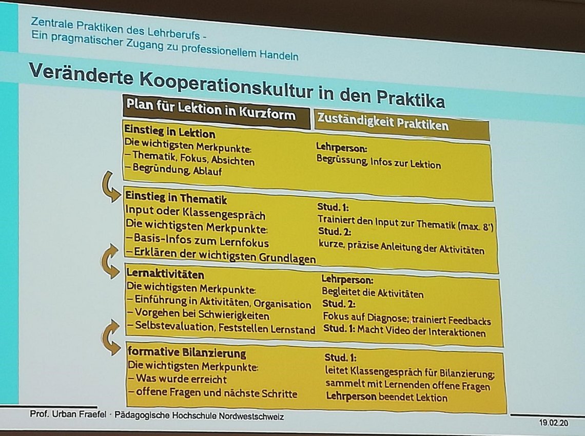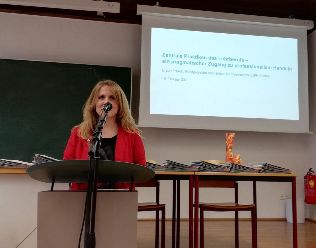 Der Festakt wurde durch ein Referat von Prof. Urban Fraefel mit dem Titel: Zentrale Praktiken des Lehrberufs – ein pragmatischer Zugang zu professionellem Handeln untermauert. Der Referent geht davon aus, dass „angehende Lehrpersonen im Berufseinstieg nicht scheitern wollen. Sie erwarten deshalb, dass ihnen berufliche Handlungssicherheit vermittelt wird. Es ist aber bekannt, dass es keinen «fast track» zu sicherem Handeln gibt, denn für einfache Rezepte ist der Lehrberuf viel zu komplex. Anstelle simpler Anleitungen vermittelt die Lehrer*innenbildung deshalb reichhaltiges Basiswissen und mögliche Handlungsoptionen quasi auf Vorrat und erwartet, dass dies in der Praxis abgerufen und wirksam werde. Der Ansatz der Praktiken – «core practices» – geht den umgekehrten Weg zu Professionalität. Ausgehend von konkreten Anforderungen sollen die Studierenden bedeutsame Handlungsstrategien beharrlich aufbauen und flexibilisieren. Dabei erschließen sie sich das erforderliche Professionswissen. Mit verinnerlichten, tief verstandenen und flexiblen Praktiken kann eine Lehrperson auch im Berufseinstieg professionell auf wiederkehrende Aufgaben des Berufsalltags antworten.“ (Fraefel 2020)