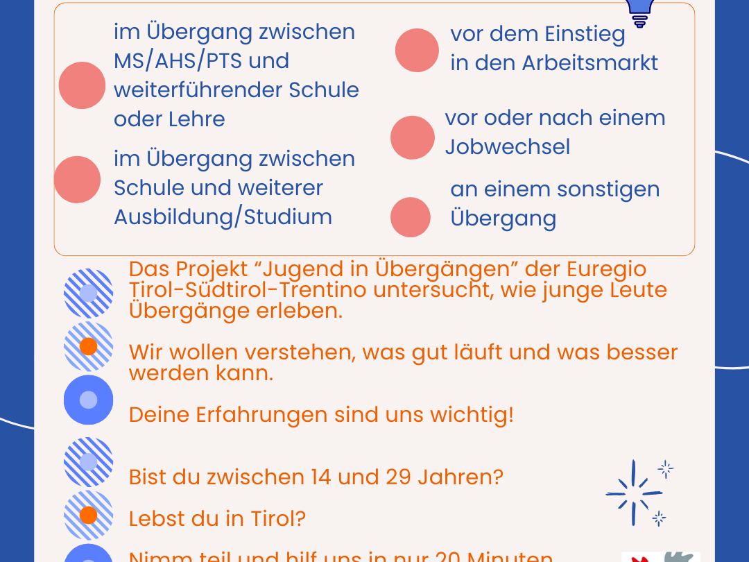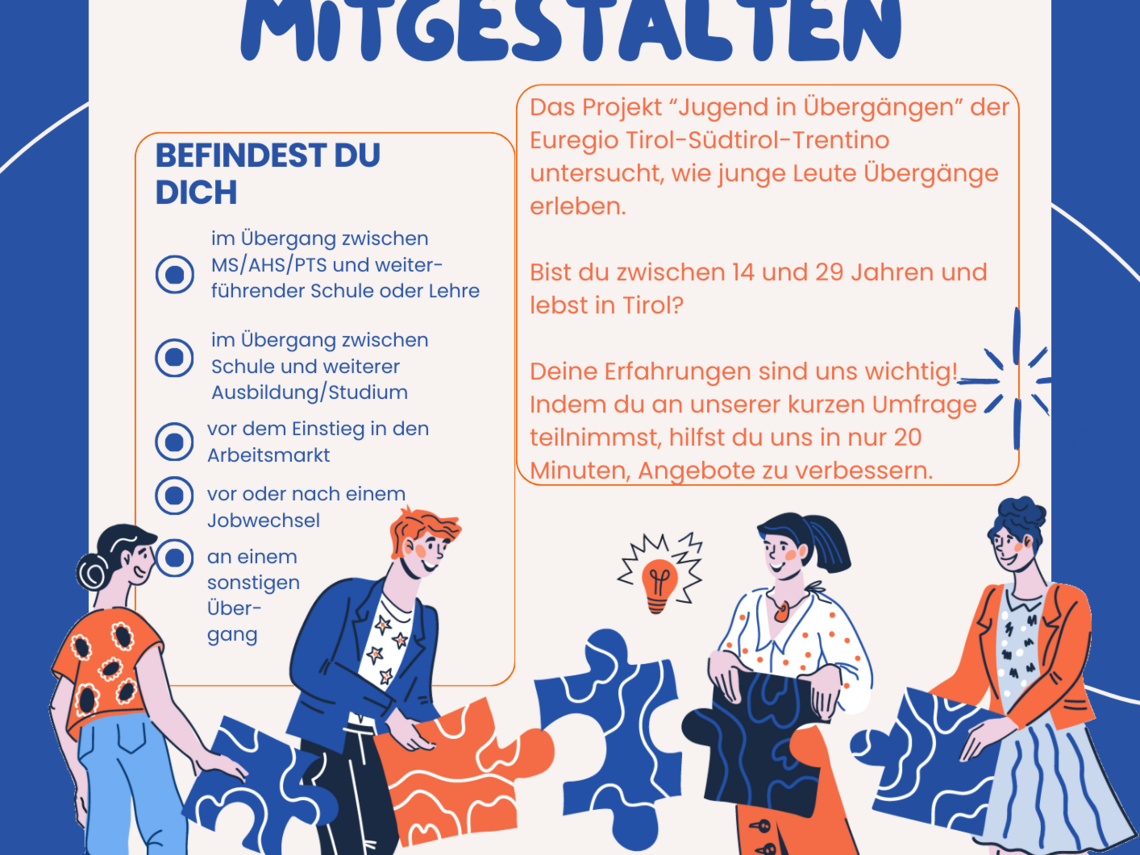 - Das Projekt "Jugend in Übergängen" der Euregio Tirol-Südtirol-Trentino untersucht, wie junge Leute Übergänge erleben.