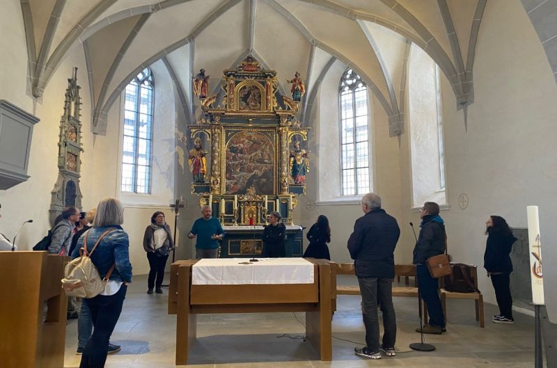 Den Erlebnisraum Gotteshaus hat Dr. Markus Hofer in eindrücklicher Weise in seinen Heimatkirchen in Götzis zahlreichen Religionspädagog:innen erschlossen. Eine nahezu 1000-jährige reich bebilderte Kirchenbaugeschichte lässt sich in der Alten Götzner Kirche aufblättern, welche der Referent mit spannenden Details lebendig werden ließ und mit der Geschichte seines Ortes und der Region verknüpfte. Als Kontrapunkt diente noch der Besuch in der Neuen Götzner Kirche, die mit ihrer schlichten Klarheit, beeindruckenden Größe und den wunderbaren Glasfenstern von Martin Häusle zum Innehalten einlädt. | Hans Peter Tiefenthaler