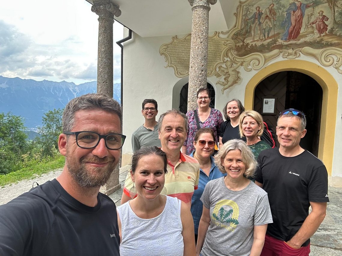 Am 30.06.2025 feierten die Mitarbeiterinnen und Mitarbeiter unseres Instituts den gemeinsamen Abschluss des Arbeitsjahres 2024/25. Nach der Abschlusskonferenz, bei der wir unseren langjährigen Kollegen David Erhart verabschiedeten, machten wir uns auf den Weg nach Heiligwasser oberhalb der Gemeinde Igls. Auf dem Fußweg zu unserem Zielort beantworteten wir – jeweils zu zweit – Reflexionsfragen zum vergangenen Arbeitsjahr. In der Wallfahrtskapelle angekommen, teilten wir miteinander einige Erlebnisse, die uns während des vergangenen Arbeitsjahres bestärkt und getragen haben, aber auch jene Momente, die uns viel Kraft kosteten. Abschließend stärkten wir uns auf der Terrasse des Wallfahrtsgasthauses mit vielen Köstlichkeiten, die uns serviert wurden.