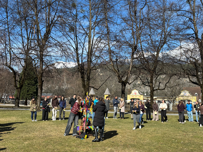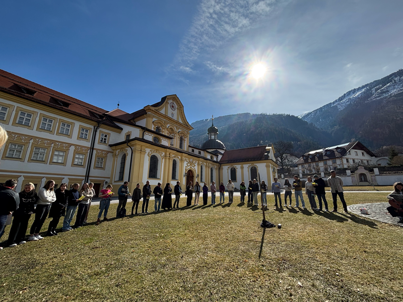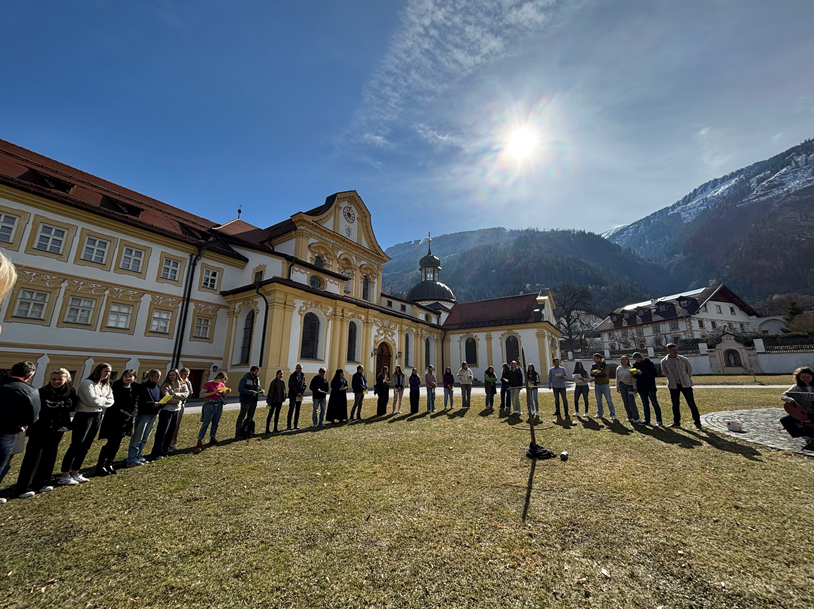 Am Montag, 16.03.2026, gestalteten Studierende des Schwerpunkts Religionspädagogik unter dem Motto „Pray4Peace“ im Stiftshof unseres Hochschulstandortes in Stams ein Friedensgebet. Bunte Stoffstreifen standen dabei symbolisch für den jeweils persönlichen Beitrag: für inneren Frieden ebenso wie für zwischenmenschliche Versöhnung. Gemeinsam setzten Studierende und Hochschullehrende ein Zeichen für Respekt, Verbundenheit und Hoffnung. Einen besonders berührenden Beitrag leistete Farid aus Syrien mit einem arabischen Gebet.