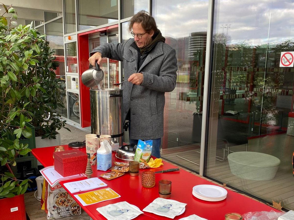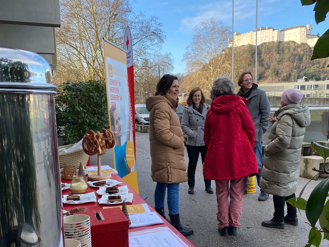 Unter diesem Motto haben die Mitarbeiter:innen des IRPB Salzburg und Studierende des Schwerpunkts Religionspädagogik an der PH Salzburg einen Glühweinstand organisiert. Bei wärmendem Bio-Glühwein und kleinen Snacks bot sich die Gelegenheit, über persönliche, aber auch organisatorische Fragen zum Schwerpunkt Religionspädagogik ins Gespräch zu kommen.