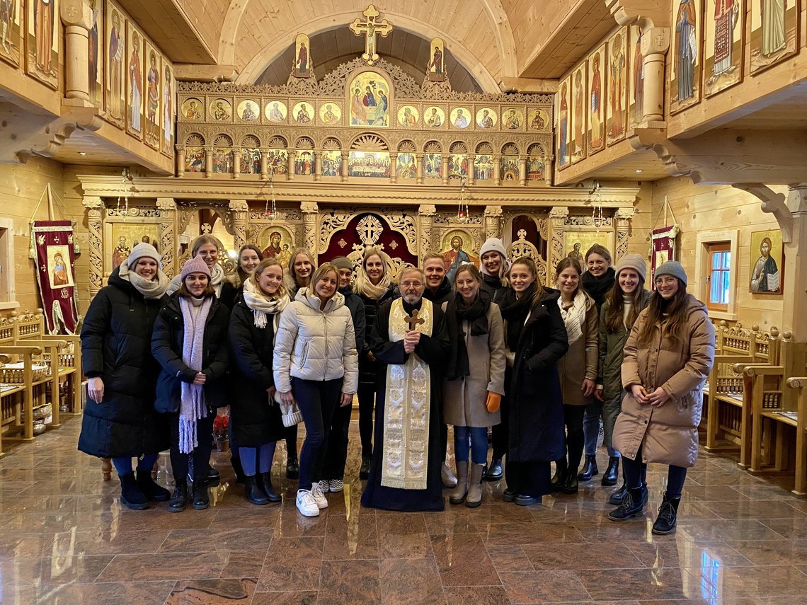 In diesem Wintersemester machte sich die Schwerpunktgruppe auf den Weg in verschiedene sakrale Räume: Nach einer Einführung in das Feld der Sakralraumpädagogik stand zunächst ein Besuch in der rumänisch-orthodoxen Kirche bei Priester Dr. Dumitru Viezuianu auf unserem Plan. Die Studierenden waren von dem warmherzigen Empfang sehr berührt und genossen ausführliche Erklärungen zur Kirche und Gemeinschaft.