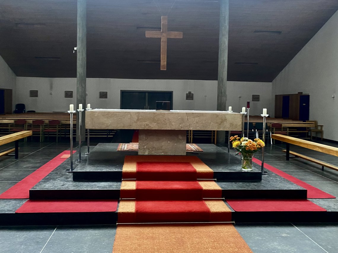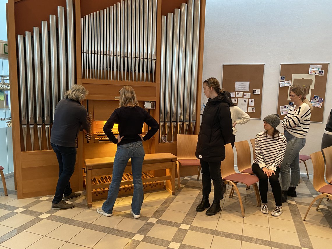 An unserem letzten Termin trafen wir uns in der Evangelischen Auferstehungskirche in Gneis. Hausmeister Jörg Hörz hieß uns herzlich mit Kaffee und Keksen willkommen und führte uns in die Architektur der Kirche ein. Anschließend kam Pastorin Karin Kirchtag, erklärte uns den Kircheninnenraum und einzelne Elemente. Sie berichtete viel über die evangelische Liturgie und zog sich dafür sogar um. Eine Studentin durfte abschließend die Orgel spielen und jemand anderer die Kirchenglocken läuten lassen.