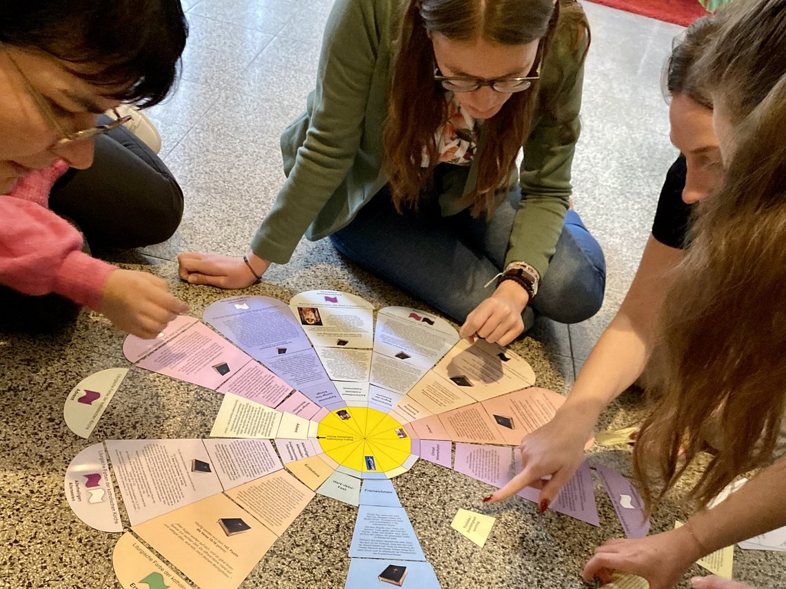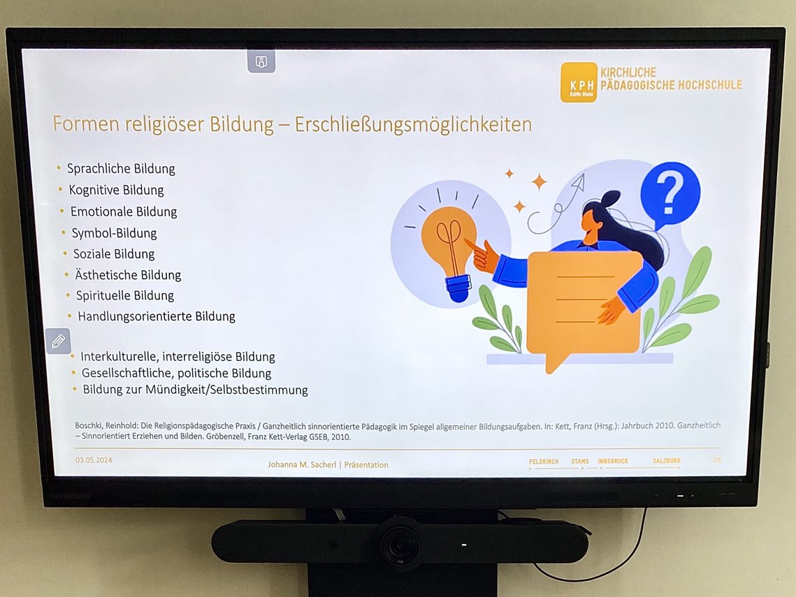 Gemeinsam wurden querbeet Unterrichtsmaterialien analysiert und in Gruppen mit der Ausarbeitung von Festen im Kirchenjahr begonnen. Folgende drei Punkte waren dabei ausschlaggebend: (biblischer) Hintergrund, Entstehung/Bedeutung/Tradition und didaktische Vermittlungsmöglichkeiten gemäß der vorgestellten Formen religiöser Bildung (siehe Foto). Diese Ausarbeitungen werden in Einzelarbeit als Vorbereitung für die Modulprüfung fortgeführt und am dritten Termin präsentiert.