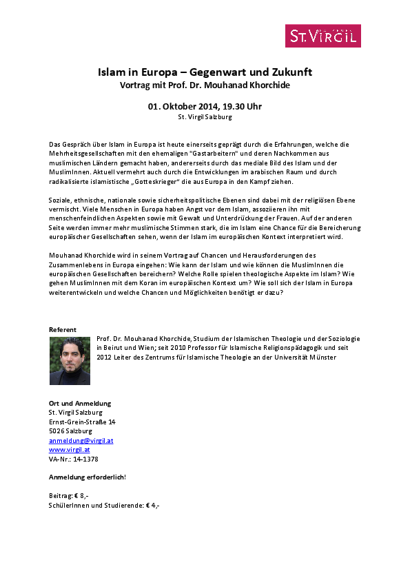 Mouhanad Khorchide wird in seinem Vortrag auf Chancen und Herausforderungen des Zusammenlebens in Europa eingehen: Wie kann der Islam und wie können die MuslimInnen die europäischen Gesellschaften bereichern? Welche Rolle spielen theologische Aspekte im Islam? Wie gehen MuslimInnen mit dem Koran im europäischen Kontext um? Wie soll sich der Islam in Europa weiterentwickeln und welche Chancen und Möglichkeiten benötigt er dazu?